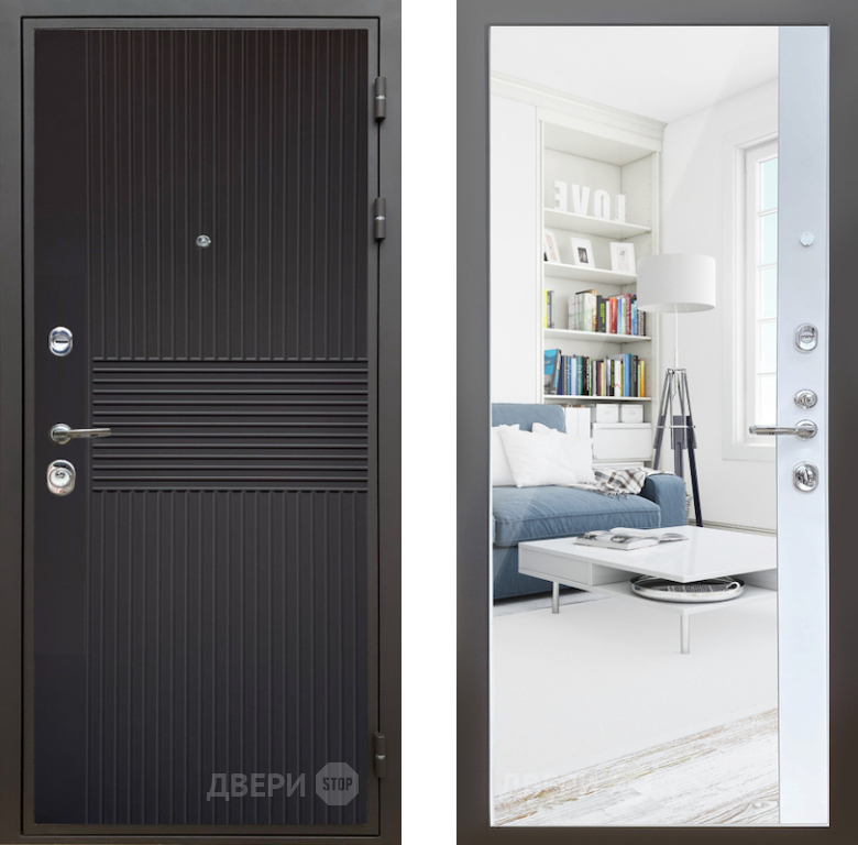 Входная Дверь Шелтер (SHELTER) Комфорт Черная шагрень 14 с зеркалом Белый матовый 860x2050 мм